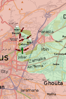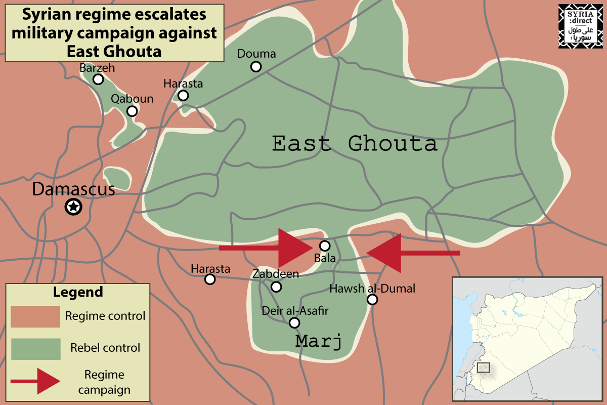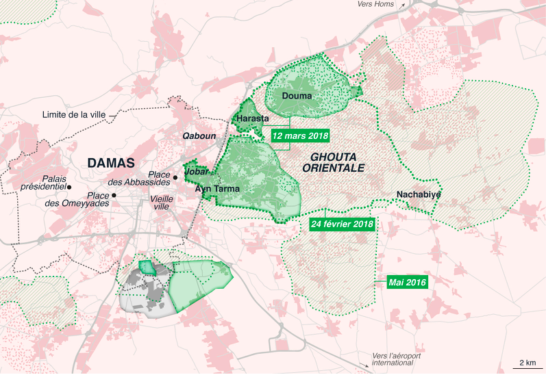As the map from Le Monde shows, the rapid advance of pro-goverbment forces across a widening front was accompanied by a second, more concentrated assault from the west on the Harasta Farms area.