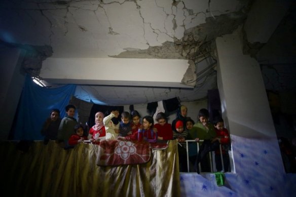 Under cracked ceilings that bulge downwards from the force of previous strikes, they string sheets across the basement to partition off rooms for entire families.