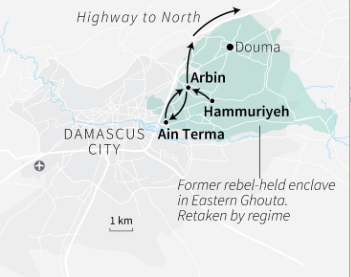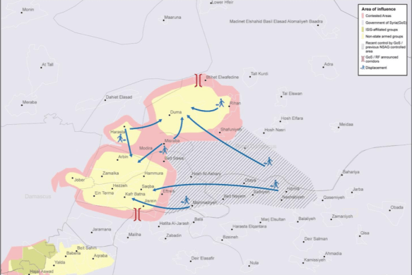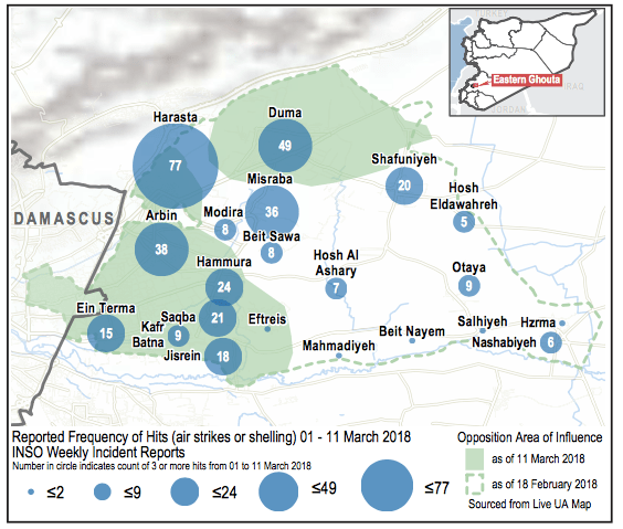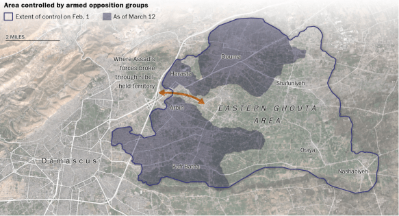 Thousands of civilians had been displaced, but as this map from OCHA (dated 12 March) shows, virtually nobody had moved through the ‘humanitarian corridors’. A second had been opened from the zone controlled by Failaq al-Rahman to the south four days earlier, but there were reports that rebel snipers had ‘slammed shut’ both escape hatches.