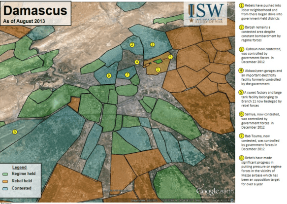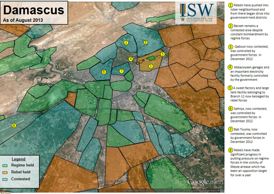 In the early months of 2013 pro-government forces stormed several towns to the south of Damascus, and there were allegations that chemical weapons had been used in the course of capturing al-Otaybeh on the southern fringe of East Ghouta in March and April (and at least two other districts outside the Ghouta). The loss of al-Otaybeh was a major blow to the rebels – it cut a major supply line from the south – and by June 2013 it was clear that pro-government forces were moving to secure the perimeter of the capital, supported by Iranian troops and militias and by Hezbollah fighters. Precisely because the situation was so fluid it’s impossible to be definitive, and the sources are fragmentary and open to competing interpretations; here is how the Institute for the Study of War summarised the state of play on 9 August 2013: