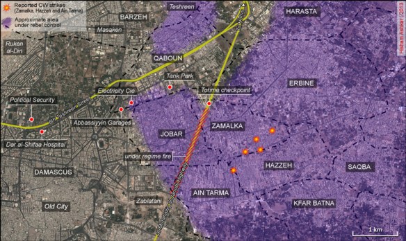 The Syrian regime has initiated an effort to rid the Damascus suburbs of opposition forces using the area as a base to stage attacks against regime targets in the capital. The regime has failed to clear dozens of Damascus neighborhoods of opposition elements, including neighborhoods targeted on August 21, despite employing nearly all of its conventional weapons systems. We assess that the regime’s frustration with its inability to secure large portions of Damascus may have contributed to its decision to use chemical weapons on August 21…