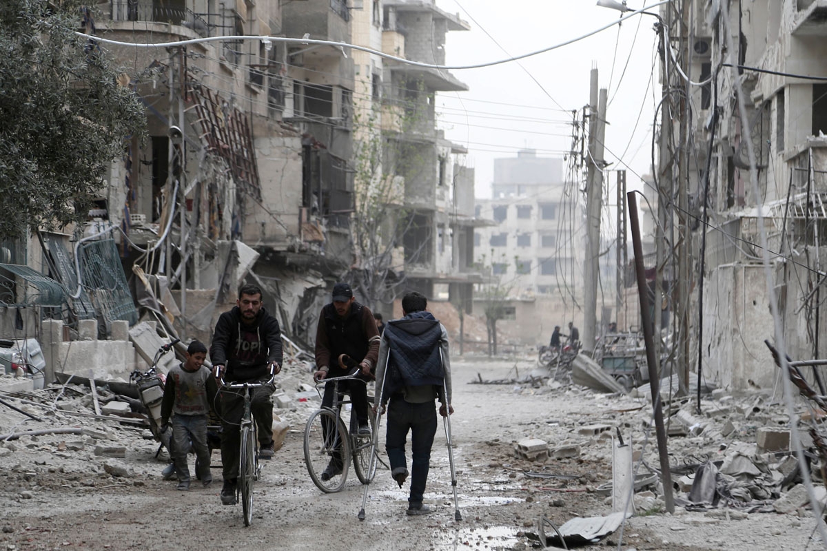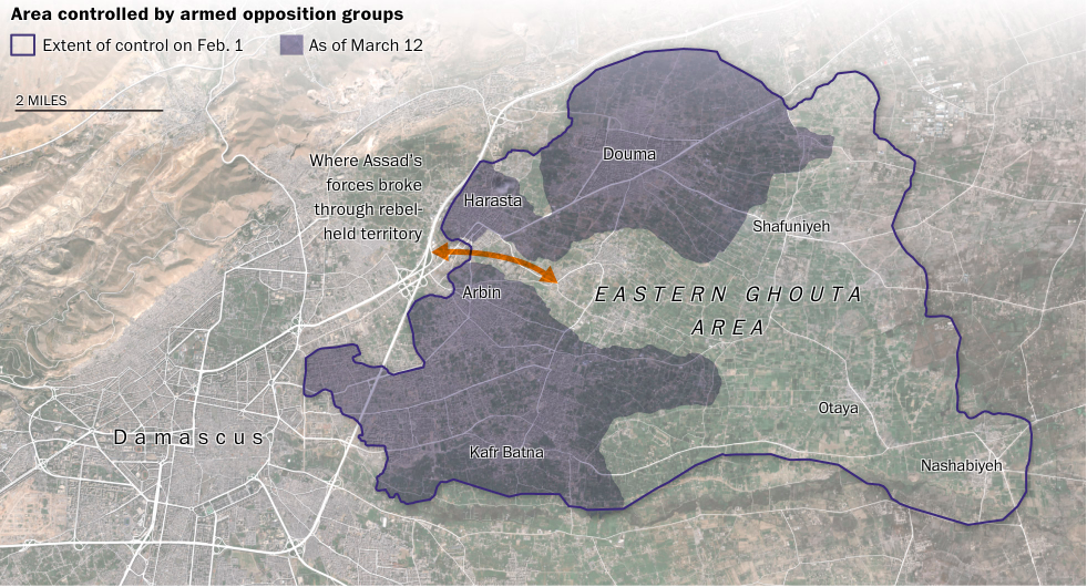 By 12 March pro-government forces had shrunk the space controlled by rebel groups in East Ghouta and the two ground offensives – across the wide front to the east and through the deepening wedge from the west – bisected and then rapidly trisected the area. They left behind scorched earth and towns of rubble.