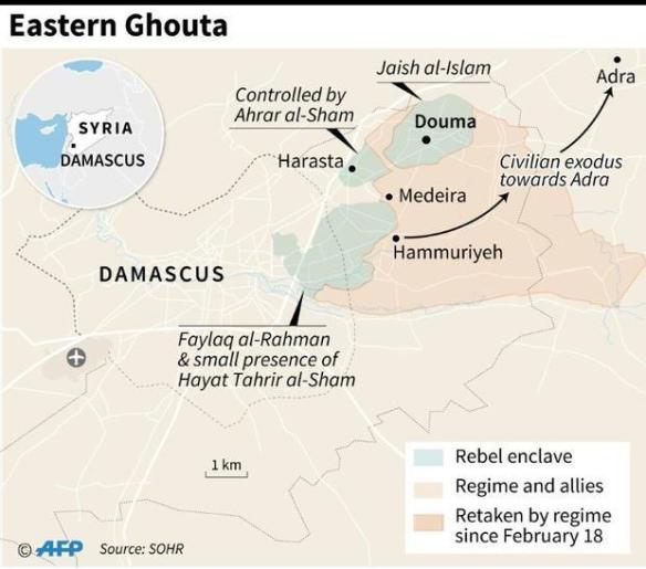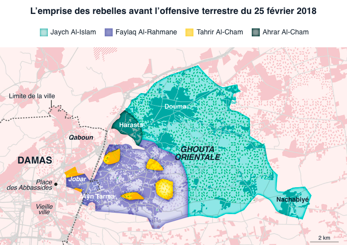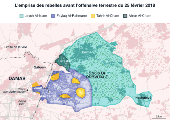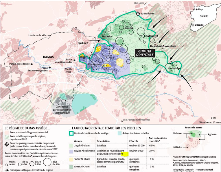 Somehow the front lines held through the first three weeks of February, and the map below (from Le Monde) shows the territories then still controlled by the main opposition groups: Jaish al-Islam on the east, centred on Douma; Failaq al-Rahman further west (the so-called ‘Central Section’), including the towns of Ayn Tarma, Irbin, Jobar and Zamalka, with some pockets under the sway of Hay’at Tahrir al-Sham (HTS); and Ahrar al-Sham, which controlled Harasta.