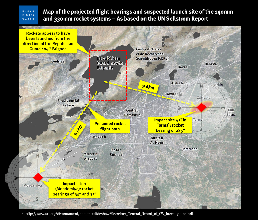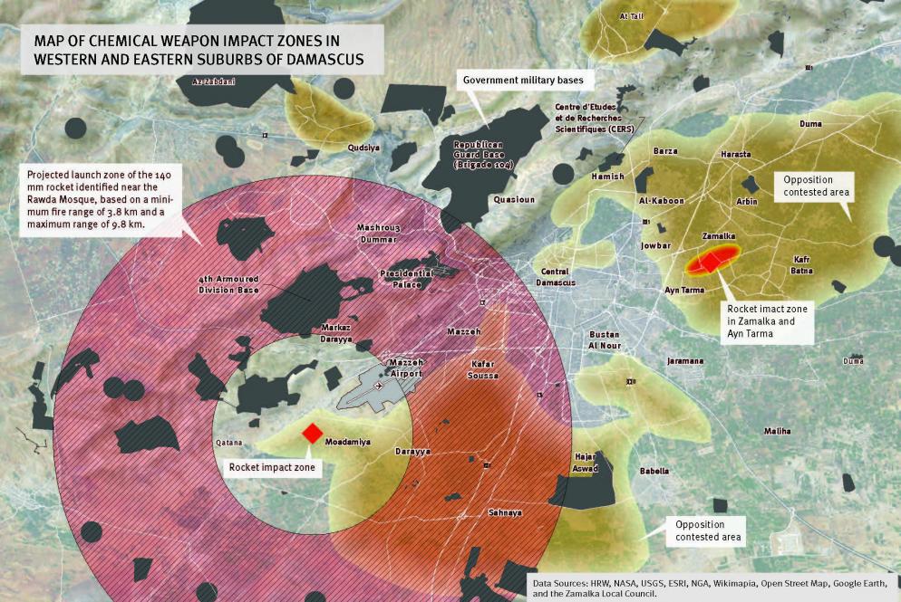 The two attack locations are located 16 kilometers apart, but when mapping these trajectories, the presumed flight paths of the rockets converge on a well-known military base of the Republican Guard 104th Brigade, situated only a few kilometers north of downtown Damascus and within firing range of the neighborhoods attacked by chemical weapons.