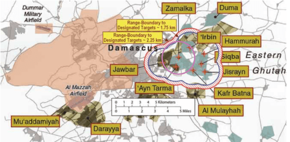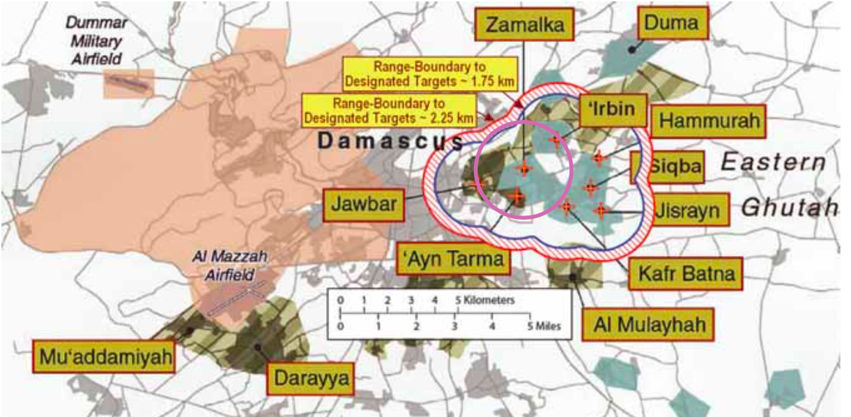 According to declassified reference guides, the 140mm artillery rocket used on impact site number 1 (Moadamiya) has a minimum range of 3.8 kilometers and a maximum range of 9.8 kilometers. The Republican Guard 104th Brigade is approximately 9.5 km from the base. While we don’t know the firing range for the 330mm rocket that hit impact site number 4, the area is only 9.6km away from the base, well within range of most rocket systems.