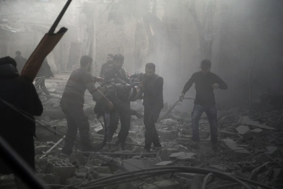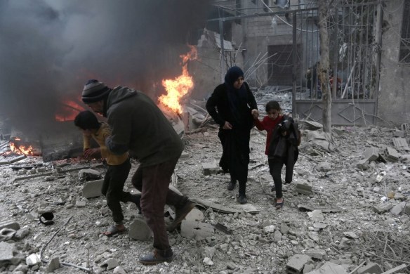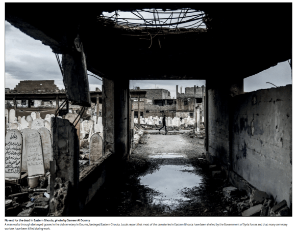 Elsewhere, the assault continued without slackening, and people continued to flee the onslaught. Those who managed to escape Hammouriyeh for shelter elsewhere in the Ghouta found respite but few found refuge. ‘We don’t know what will happen,” one exhausted man told the New York Times in a voice message, ‘the sound of rocket fire in the background. “I run to Hammouriyeh, they bomb it. I run to Zamalka, more bombing is ahead of us”’ (he was right; the photograph below by Abdulmonam Eassa shows Zamalka on 24 March).