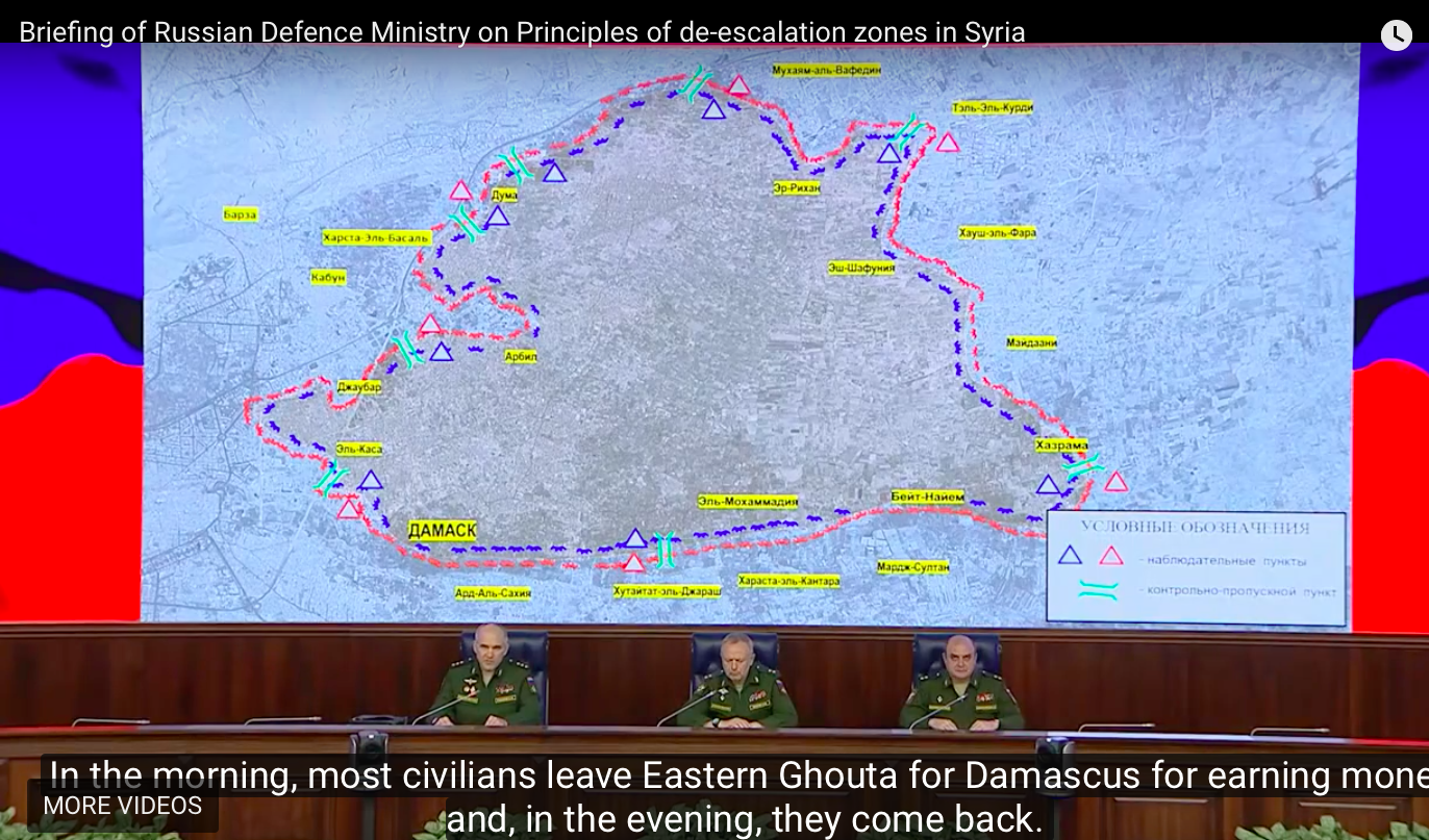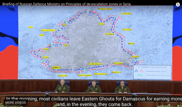 Yet in May 2017, as the attacks on Barzeh and al-Qaboun escalated, East Ghouta was recognised as one of four ‘de-escalation zones‘ through an agreement between Russia, Turkey and Iran (al-Qaboun, which was described by the Russian Foreign Ministry as ‘controlled by insurgents of Jabhat al-Nusra’ [reconstituted as Hayat Tahrir al-Sham (HTS)], was explicitly excluded from the agreement). The Ministry’s briefing was a surreal affair, conjuring up a world in which there was no siege at all: ‘In the morning, most civilians leave Eastern Ghouta for Damascus for earning money, and, in the evening, they come back.’