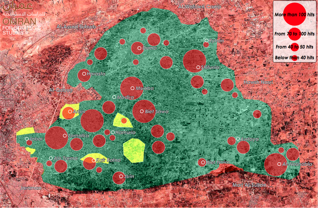 The aerial assault never slackened, and the death toll mounted. As this map shows, the focus of air strikes and artillery bombardments shifted again, back from the east to the west, focusing on Harasta and the area to the south controlled by Failaq al-Rahman: