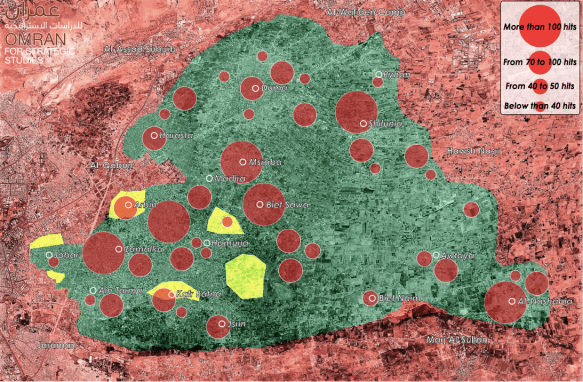 Over the same period the region also came under artillery fire from Syrian batteries launching missiles and rockets from Mount Qassioun and from other ground forces firing mortars from positions much closer to the front lines.