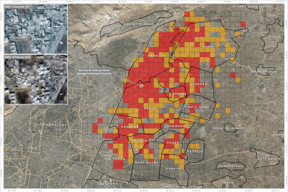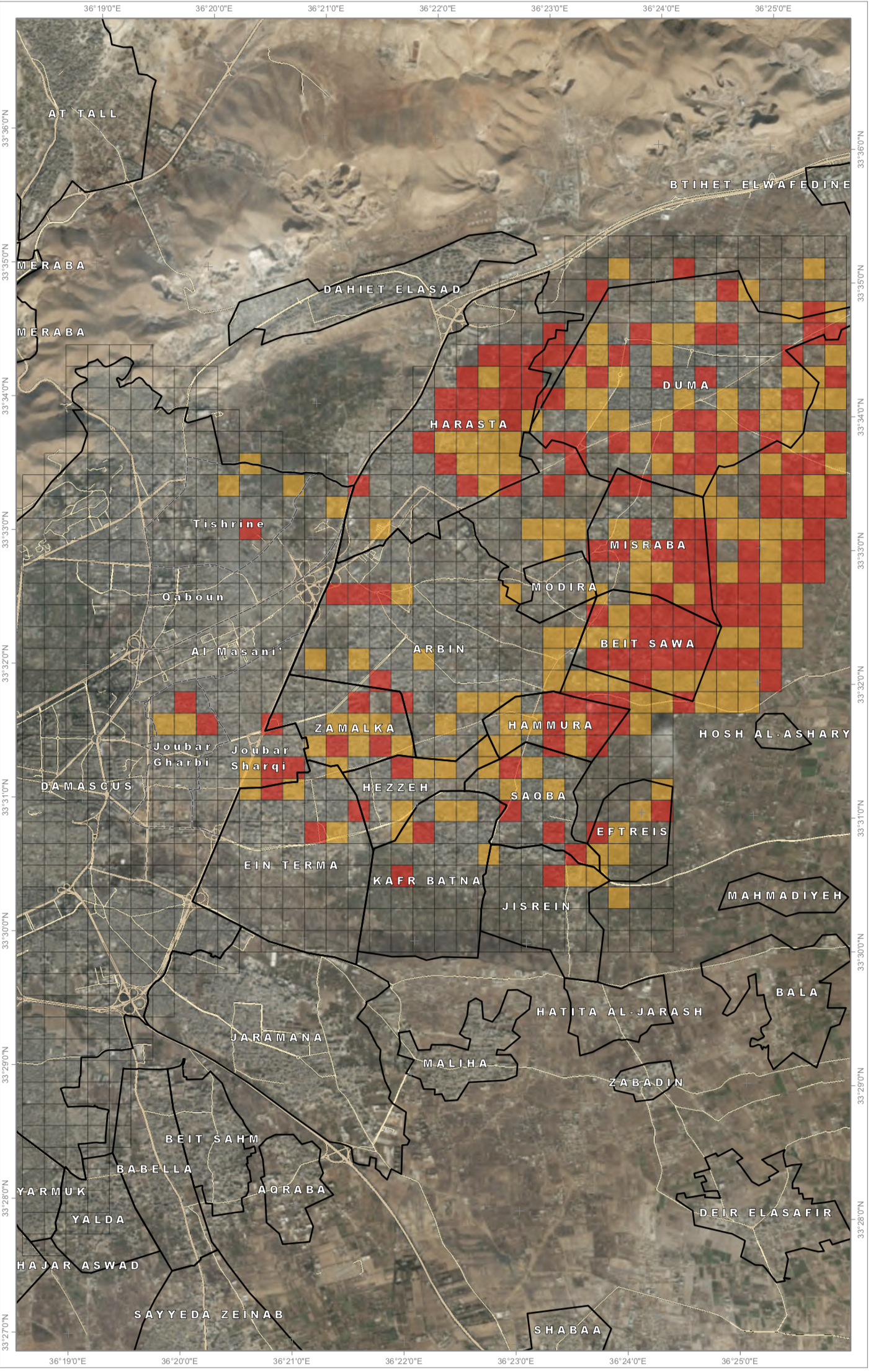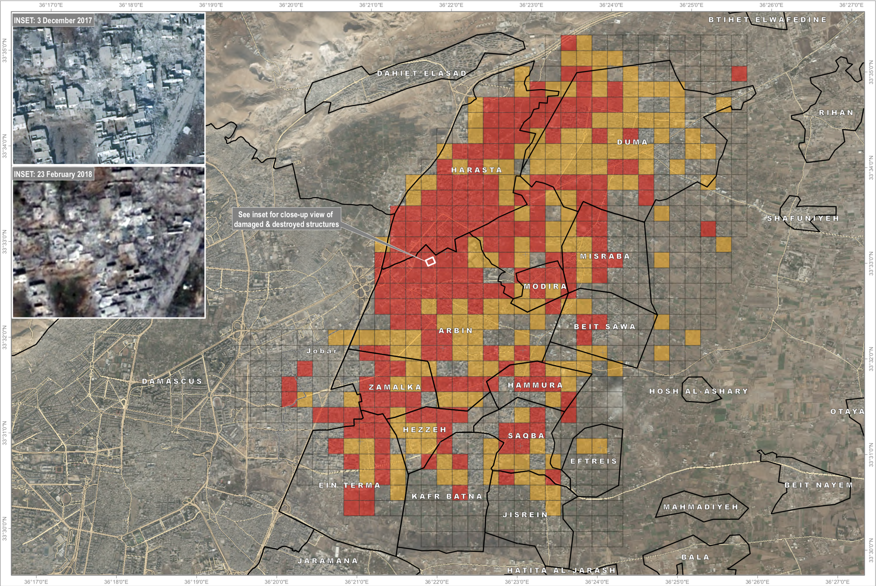 Satellite imagery confirmed the extent of the physical devastation (see also here). The first map shows new physical damage between 3 December and 23 February; the orange cells show ‘minor damage’ caused between those dates, the red cells ‘major damage’. Analysis showed ‘29% of the cells were affected by major new damage, with presence of buildings completely destroyed or severely damaged between 3 December 2017 and 23 February 2018.’