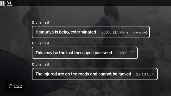 Hammouriyeh’s residents have borne the brunt in the last few days with a relentless onslaught of barrel bombs, mortars and chemical strikes, until surrender looked to be the only remaining option. The last of the messages from inside Hammouriyeh came in the middle of the night on Wednesday [14 March]. “More than 5,000 people are at risk of annihilation,” a doctor in the town said via [WhatsApp] text. “Please get our voice out to the world, this might be the last message I’m able to send. The wounded are in the streets and cannot be moved and the planes are targeting any movement. I witnessed an entire family getting killed in front of me by air strikes, I’m by a basement trying to send this message.” The internet connection in the town went down shortly after and their fate is unknown.
