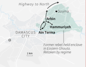 These were difficult, traumatic decisions that often divided families, and in a later post I’ll discuss the fate of the deportees, those who moved to nearby resettlement camps and government shelters (usually with the desperate hope of returning to Ghouta in an uncertain future), and those who stayed in what was left of their homes. But these capitulations left Jaish al-Islam isolated in its stronghold of Douma. There were reports that JAI was preventing civilians from leaving the town, who were caught between the fear of being shot and the fear of being bombed, but small groups of exhausted people fled on foot through the al-Wafideen corridor. According to a spokesperson for the International Committeee of the Red Cross,