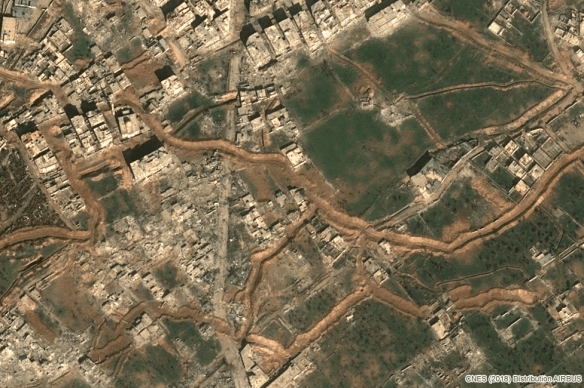 Fisk (above) was not wrong about the rebels’ mastery of underground operations. As the Syrian Arab Army advanced from the east it encountered a formidable trench system cutting across the rural landscape, and as this satellite image reveals there were trenches carved across the heart of Ghouta too (those brown scars):