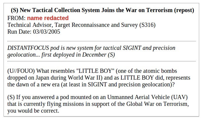 Speeding up the targeting cycle has involved more than the pre-emptive identification of targets. In contrast to the fixed targets for nuclear strikes, today’s Predators and Reapers are typically directed against mobile targets virtually impossible to locate in advance. Pursuing these fleeting ‘targets of opportunity’ relies on a rapidly changing and expanding suite of sensors to identify and track individuals in near-real time. In 2004 the Defense Science Board recommended the Pentagon establish ‘a “Manhattan Project”-like program for ID/TTI’ [identification, tagging, tracking and locating], and one year later a Technical Advisor working for the National Security Agency’s Target Reconnaissance and Survey Division posed the following question: