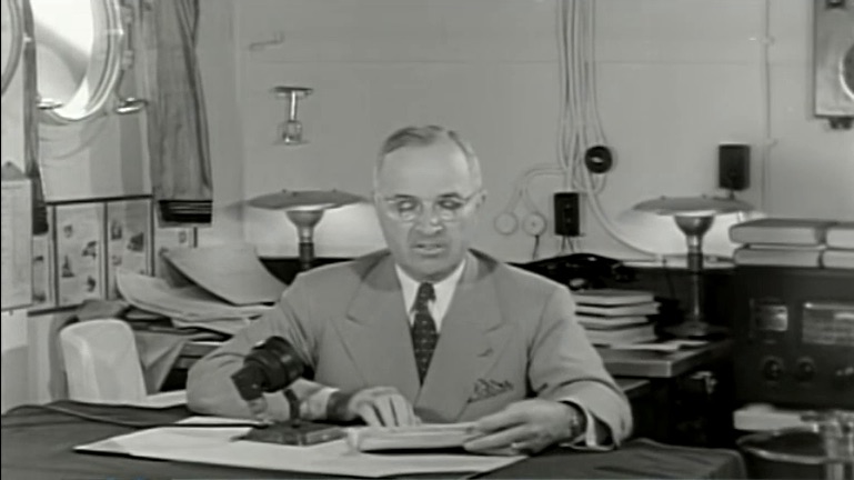 For all these connections and intersections, a key divide is the issue of civilians and casualties. On 9 August 1945 President Truman (below) described Hiroshima as a ‘military base’ selected ‘because we wished in this first attack to avoid, insofar as possible, the killing of civilians’.