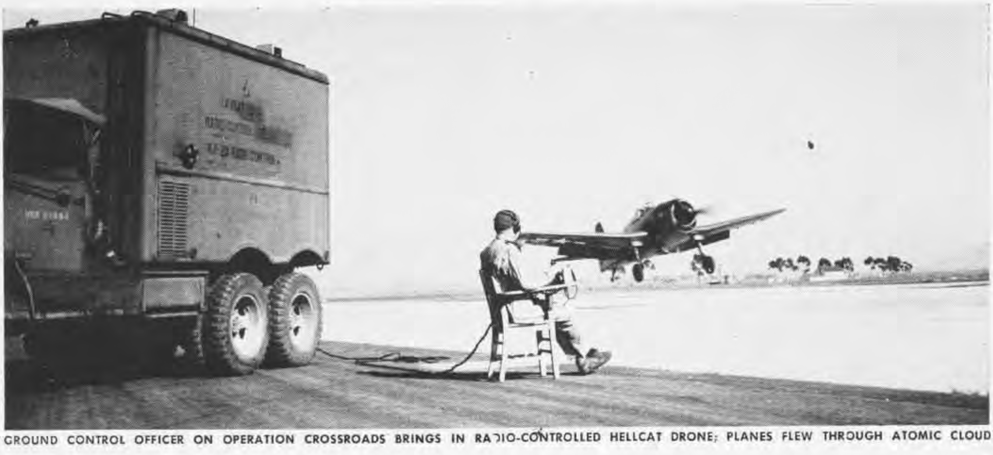 This was a re-run of Operation Aphrodite, a failed series of experiments carried out in the closing stages of the Second World War in Europe, and – as the images below show – after the war the Air Force had continued to experiment with B-17 aircraft remotely piloted from both ‘director aircraft’ [top image; the director aircraft is top right] and ‘ground control units’ [bottom image].  These operated under the aegis of the Air Force’s Pilotless Aircraft Branch which was created in 1946 in an attempt to establish the service’s proprietary rights over missile development.