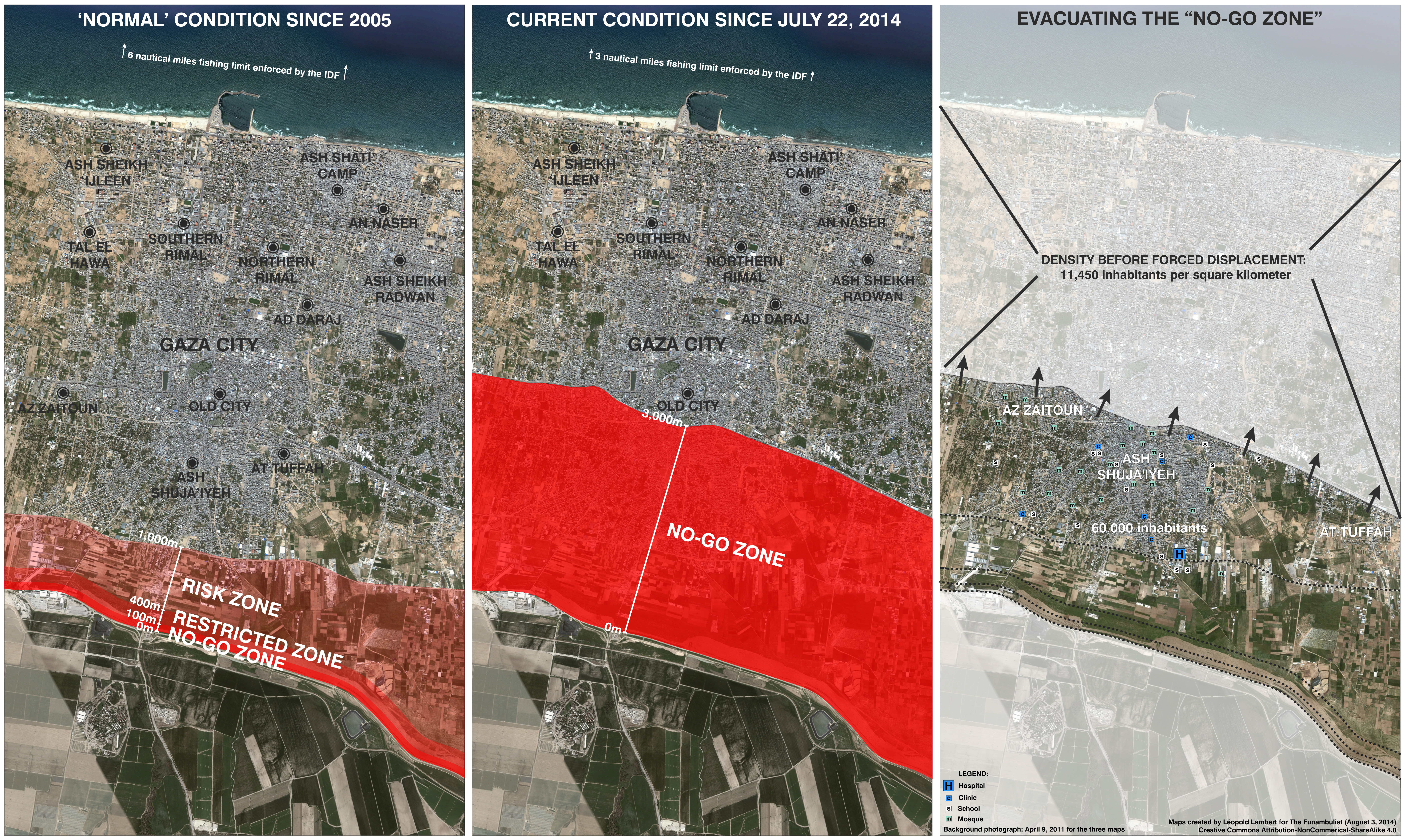(4) Smith justifies the pattern of destruction shown on his maps by claiming that ‘the main objective of Operation Protective Edge was to find and destroy dozens of terror tunnels dug from Gaza into Israel.’ In fact, the stated objectives of the Israeli assault changed throughout the campaign. The attacks were supposedly sparked by the kidnapping and murder of three Israeli teenagers – in the West Bank not Gaza – and as the mission was ratcheted up so their central objective changed: according to the IDF the aim was to put an end to Hamas rockets being fired into Israel (for a radically different view, see Graham Liddell‘s more general discussion at Mondoweiss here). The rhetoric of ‘terror tunnels’ came later. And while Smith is right to draw attention to the swathes of destruction to the east of Gaza’s central spine, he never addresses the human consequences of successive Israeli expansions of this so-called ‘buffer zone’ until it covered more than 40 per cent of Gaza: see my post here for more details.