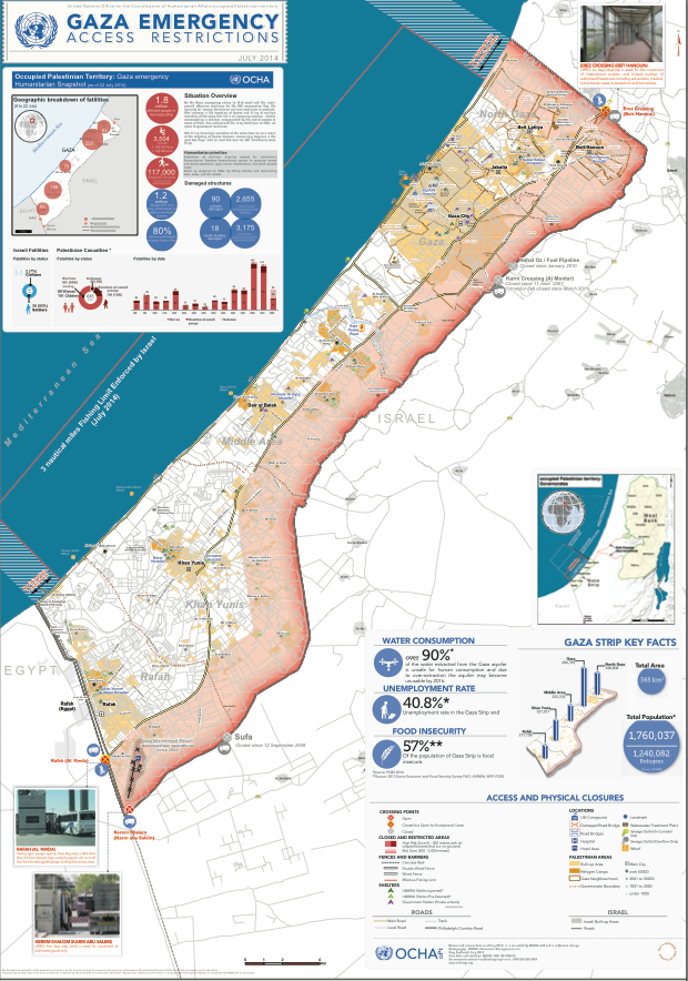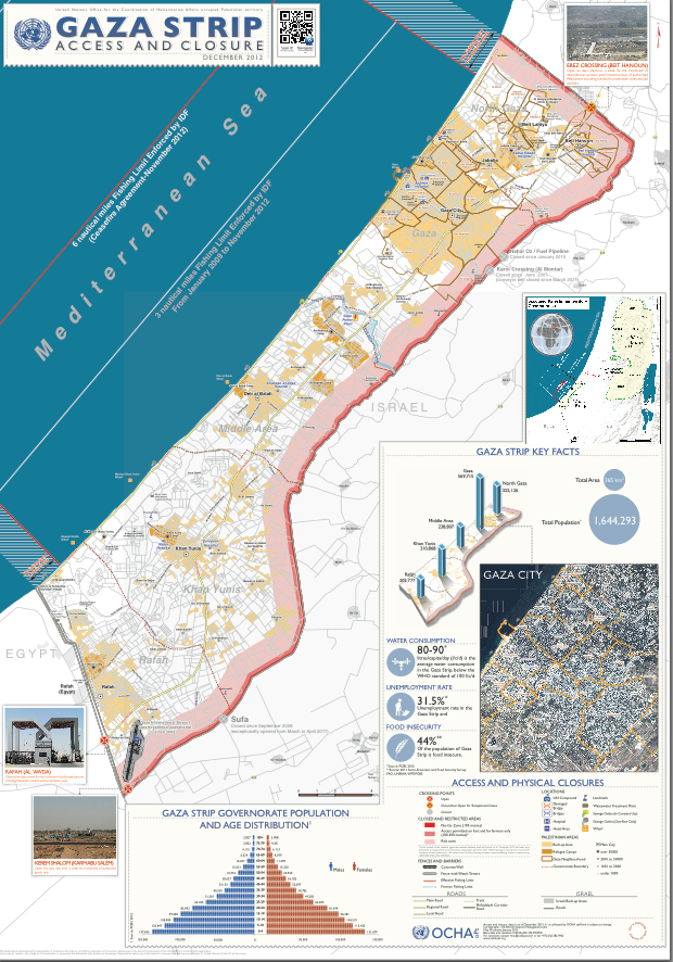 It’s strange how things sometimes come together – or collide and crash. Two weeks ago I wrote about satellite imagery and ‘remote violence’, and over the summer I discussed several projects that mapped Israel’s military assault on Gaza and its people, including the Gaza Crisis Atlas produced by the UN’s Office for the Coordination of Humanitarian Affairs (which makes extensive use of hi-res satellite imagery).