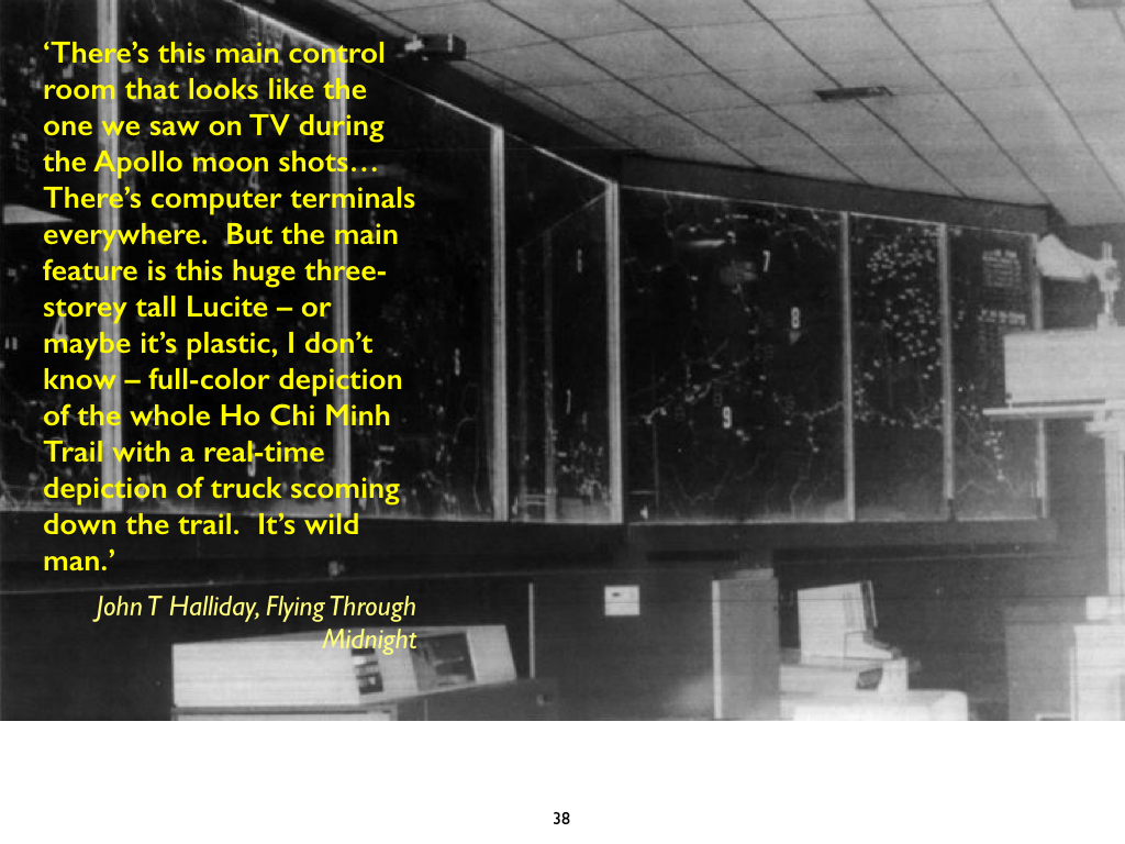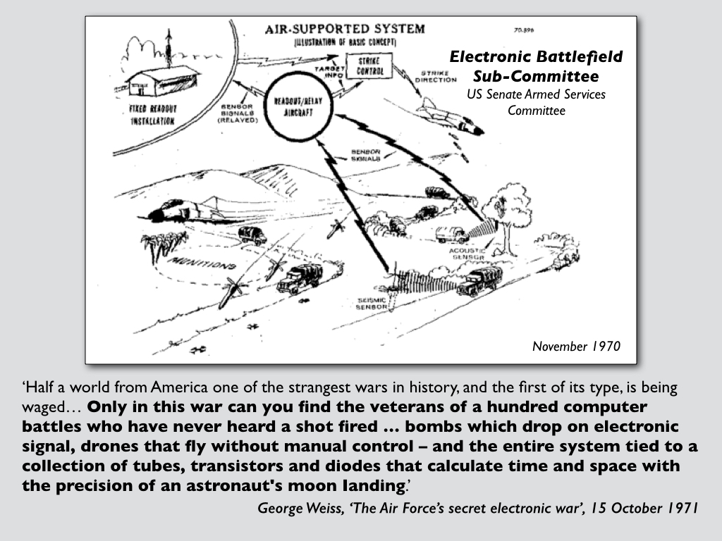 I focused on the so-called ‘electronic battlefield’ that I had discussed in detail in ‘Lines of descent’ (DOWNLOADS tab), and its attempt to interdict the supply lines that snaked along the Ho Chi Minh Trail by sowing it with sensors and automating bombing: