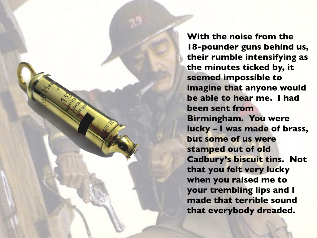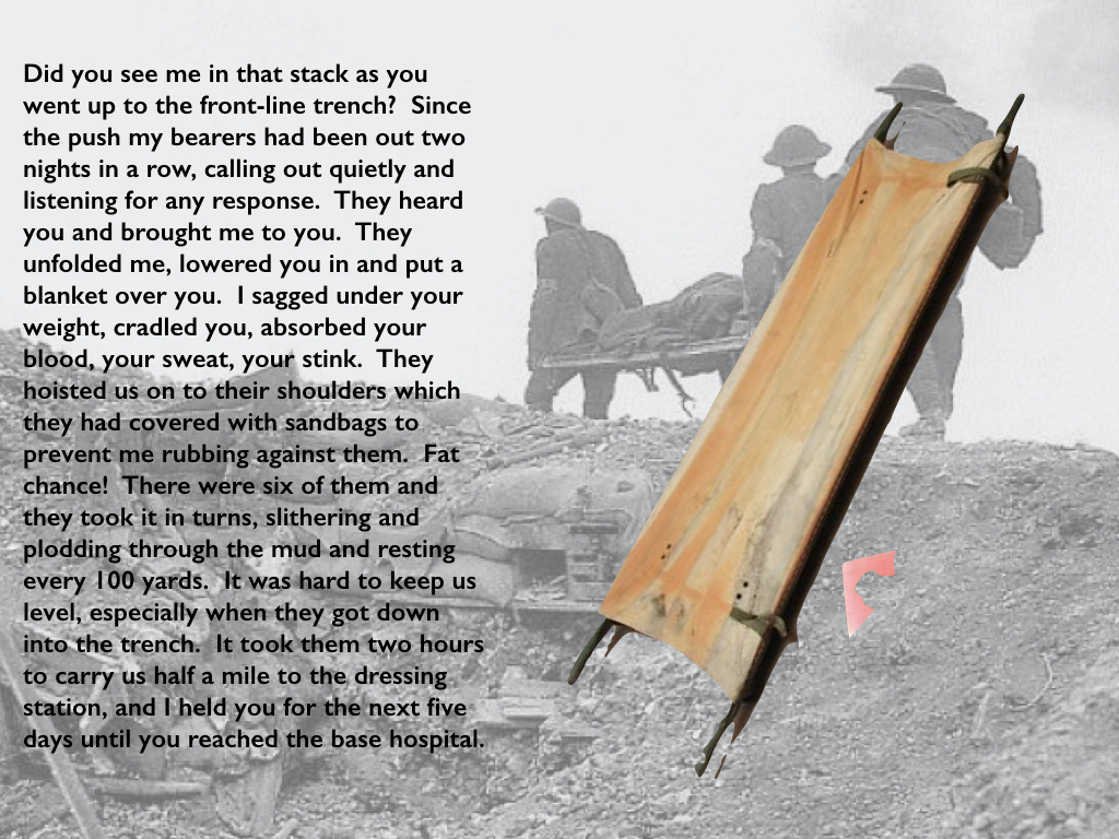 … the call ‘stretcher-bearers’, ‘stretcher-bearers’, the reply ‘No stretchers’. ‘Find one, it’s an officer.’