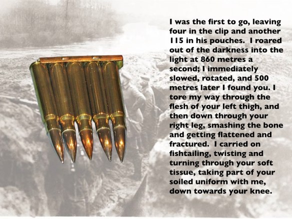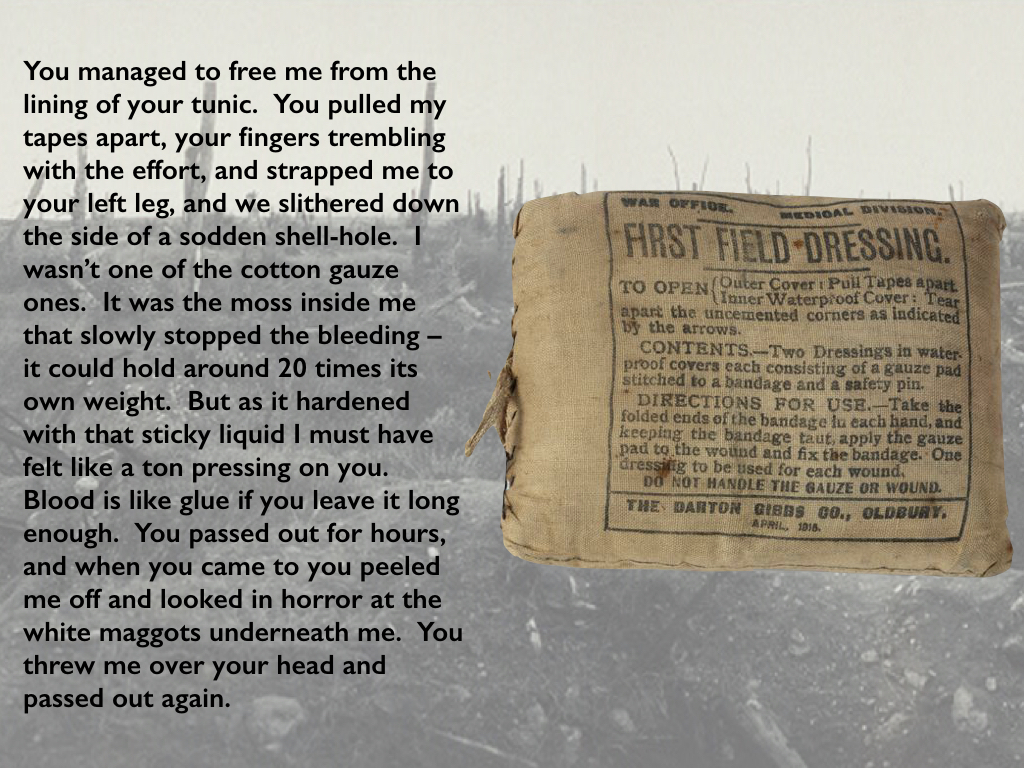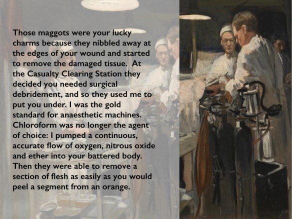 I borrowed the white maggots (and some of the other details of the wounds) from John Stafford‘s extraordinary, detailed recollection of being wounded on the Somme in August 1916 available here.