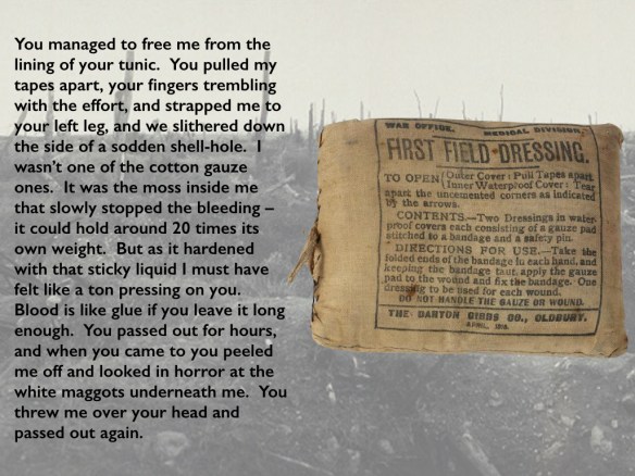A shortage of cotton (combined with its relatively high cost) together with the extraordinary demand for wound dressings prompted the War Office to use sphagnum moss – the British were years behind the Germans and the French in appreciating its antiseptic and absorbent qualities, which also required dressings to be changed less often. You can get the full story from Peter Ayres, ‘Wound dressing in World War I: the kindly sphagnum moss’, Field Bryology 110 (2013) 27-34 here.