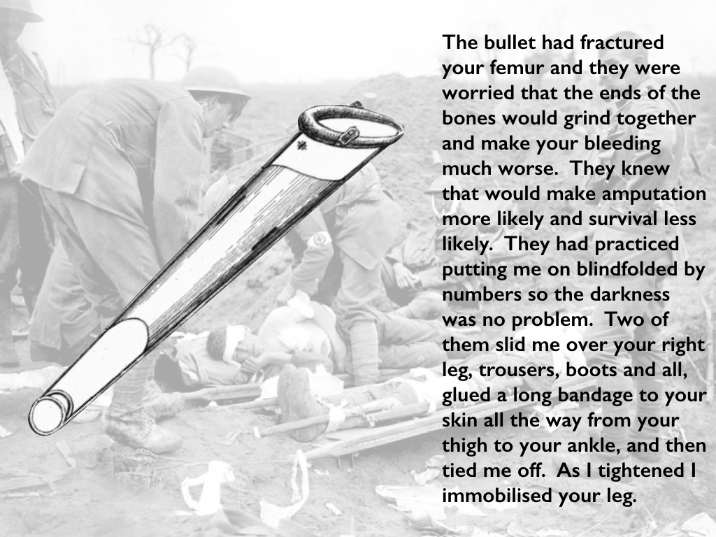 A fractured femur would turn out to be one of the most common injuries, described by Robert Jones as ‘the tragedy of the war’: if fractures were not properly splinted the soldier would arrive at the Casualty Clearing Station in a state of shock caused by excessive blood loss and pain: