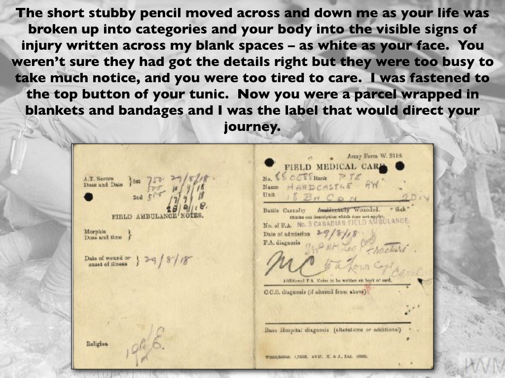 This was a major responsibility; sometimes the card was filled in at a Dressing Station, sometimes at the Casualty Clearing Station. George Carter‘s diary entry for 31 August 1915 explains its importance: