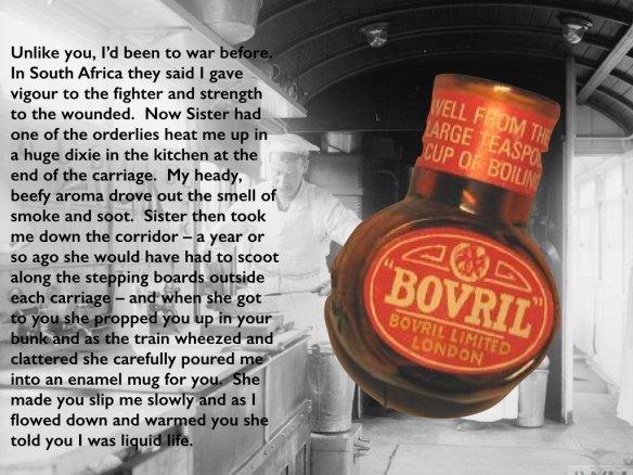 But for a plentiful supply of Bovril I don’t know what we should have done. During Neuve Chapelle and other engagements we had big cauldrons going over log fires, and as we collected and brought in the wounded we gave each man a good drink of hot Bovril and I cannot tell you how grateful they were.