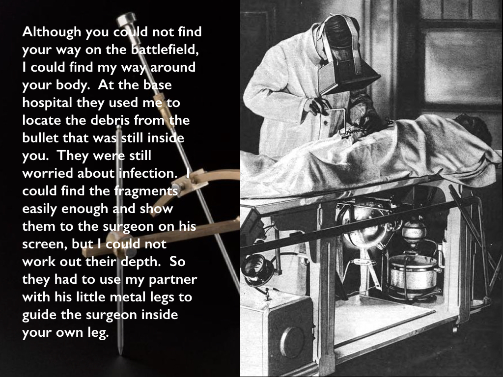 The reassuring scientificity of all this is tempered by a cautionary observation from a wounded officer, Major Sidney Greenfield, who was X-rayed at a Casualty Clearing Station:
