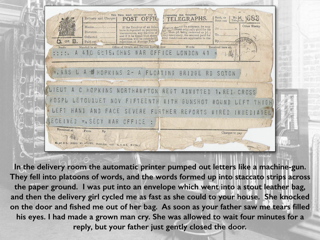 The telegram from the War Office is dated three days later, by which time Hopkins had reached the base hospital at Le Touquet. Sister Latham’s earlier account of her work at Casualty Clearing Station No. 3 at Poperinghe in 1915 is here.
