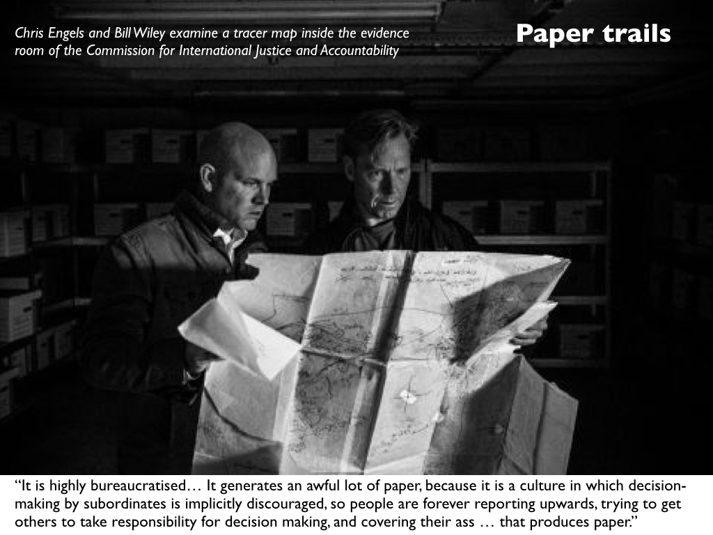 To be sure, there are other witnesses and even paper trails and photographic records. Ben Taub, who has done so much to bring ‘Syria’s war on doctors‘ to the attention of a wider public, has also provided a detailed account of the work done by Bill Wiley and the Commission for International Justice and Accountability whose volunteers have smuggled over 600,000 documents out of Syria detailing mass torture and killings by the regime.