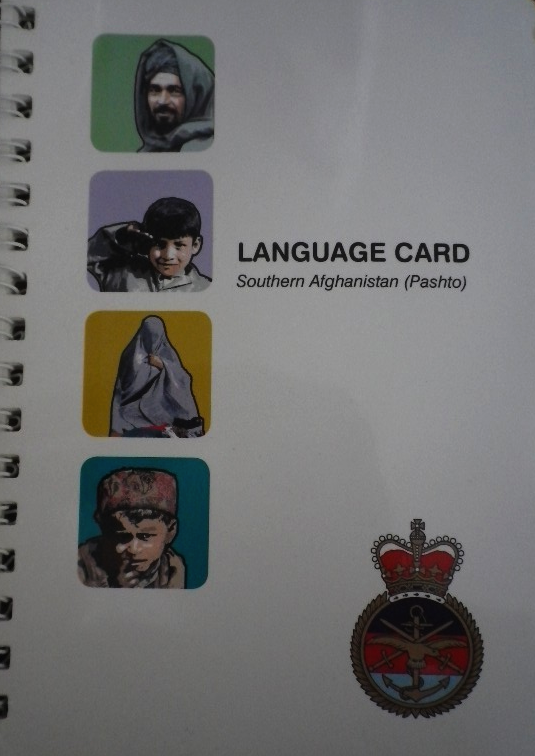 An illustrated language card issued to troops to help them communicate in Pashto and Dari, ‘a kid’s cartoon book of modern warfare’:
