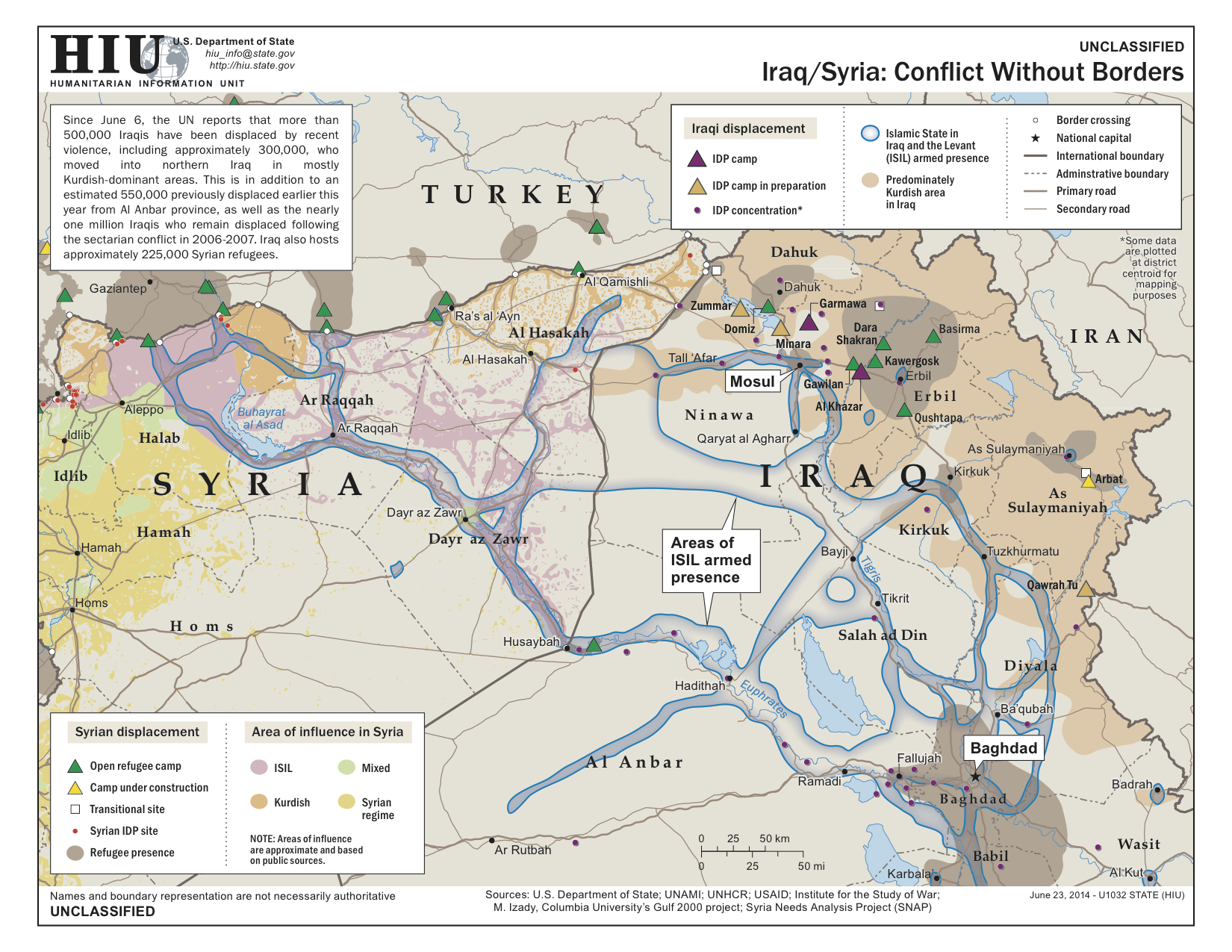 I derived the map showing the advance of IS(IS)/ISIL from the Institute for the Study of War; say what you like about their politics (this is the Kagans we are talking about), their maps and summaries are extremely helpful.