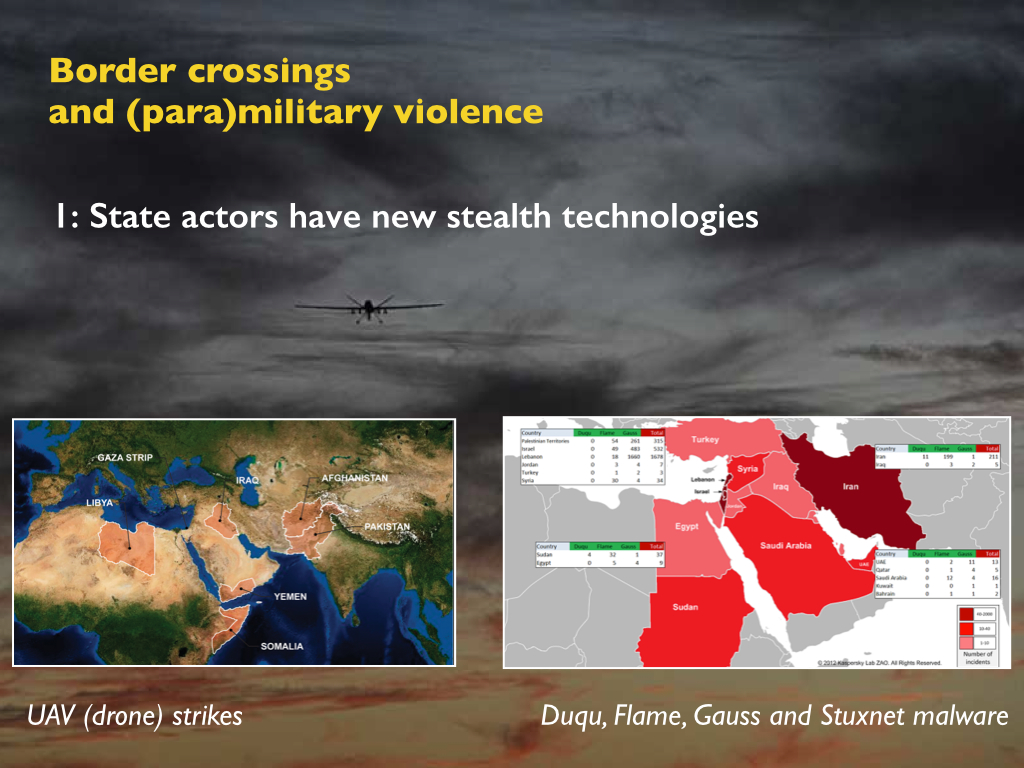 In Finland last month I gave a presentation on Law, violence and b/ordering, in which I began by making two preliminary points about border crossings and (para)military violence: trans-border incursions and transgressions have been facilitated by (i) new stealth technologies deployed by state actors and (ii) the rise of new non-state and para-state actors. Here are the relevant slides: