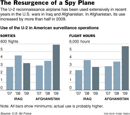 The U-2’s altitude [70,000 feet or more], once a defense against antiaircraft missiles, enables it to scoop up signals from insurgent phone conversations that mountains would otherwise block. As a result, Colonel Brown said, the U-2 is often able to collect information that suggests where to send the Predator and Reaper drones, which take video and also fire missiles. He said the most reliable intelligence comes when the U-2s and the drones are all concentrated over the same area, as is increasingly the case.