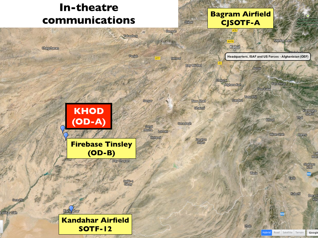 Meanwhile Colonel Gus Benton, the commander of Combined Joint Special Operations Task Force – Afghanistan (CJSOTF-A) at Bagram Air Field, the link above Kandahar in the Special Forces chain of command, was heading over to his Operations Center. This was his fourth tour of duty in Afghanistan, and like all field-grade officers he had wake-up criteria but his staff had never had occasion to disturb him before (or perhaps never dared to). But early on that Sunday morning his Night Operations Chief had phoned to alert him to the developing situation with ODA 3124. ‘I was told we had [a] TIC’ (p. 527), he recalled, though he couldn’t remember ‘specifically what he told me, I just said “Roger, okay, got it”’ (p. 542). He got up and monitored radio traffic on his desktop receiver until he decided to dress and go over to the Operations Center. He did not wait for a briefing, he told McHale: ‘I just walked in and said “Have we dropped?”’ (p. 543). It was a characteristically blunt question but it did not elicit the answer he expected. CJSOTF-A’s JAG had not been called (he never was), but Benton’s deputy did his best to justify the GFC’s tactical patience. He was a former ODB commander who had served in Tarin Kowt in 2005-6 and had experience of similar situations, and he told Benton he thought the GFC was right to wait until the vehicles were within sight of Khod. ‘I said that is what we did, we let them come to us so we can get eyes on them,’ he told McHale. ‘During my time I never let my guys [in the ODAs] engage with [Close Air Support] if they couldn’t see [the target]. I said that is great and Colonel [Benton] said “that is not fucking great” and left the room’ (p. 758).