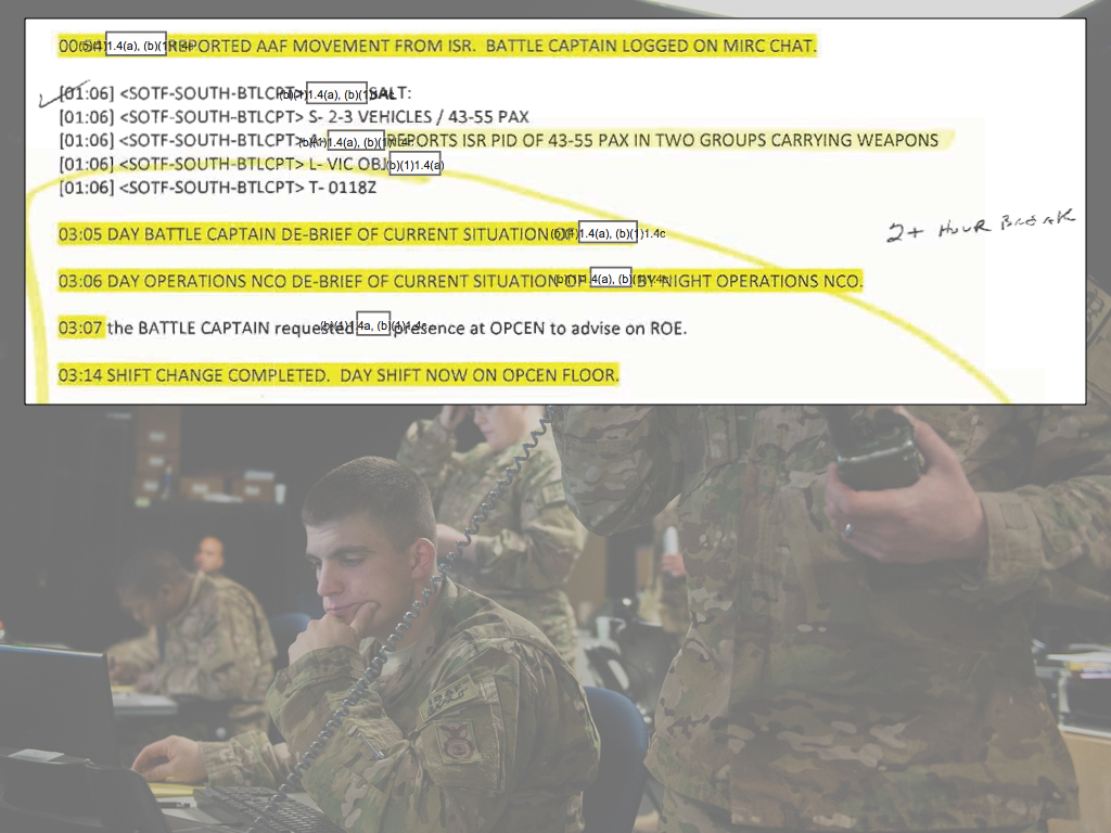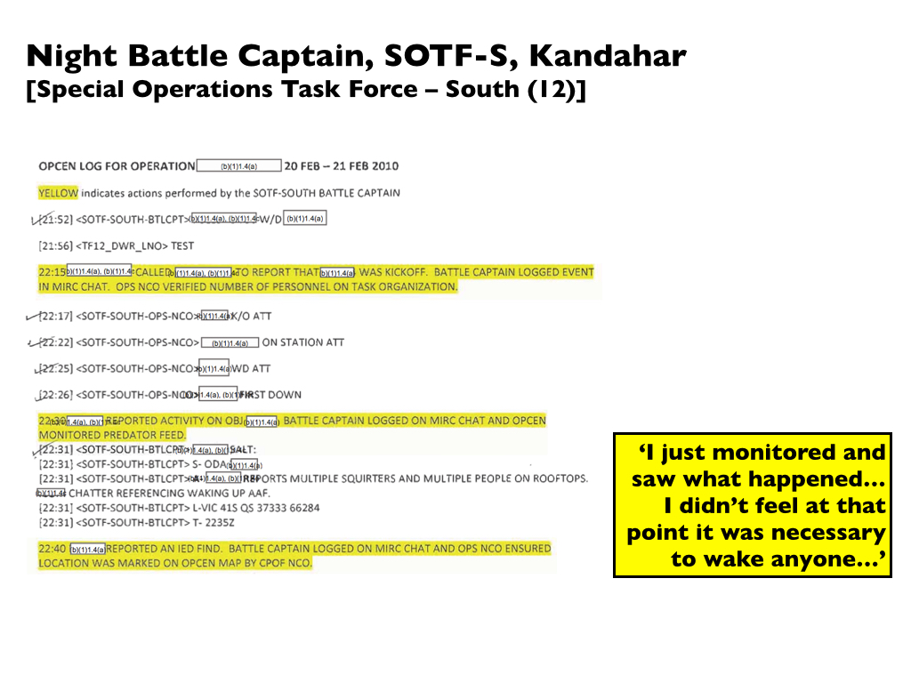 [149] During the GFC’s second interview on 5 March he was accompanied by a military lawyer, a Lt Col from the US Army Trial Defense Service (p. 988), who told McHale: ‘The records of the SALT reports end at 0630, the SALT reports continue’ – the GFC testified that ‘we were continuing to send reports throughout this time’: p. 1356 – but ‘they were the only records we were able to obtain, and this would be records that SOTF create when they receive it’ (p. 948). There were no follow-up questions from the panel; if they investigated the matter, their findings are hidden in the redactions.
