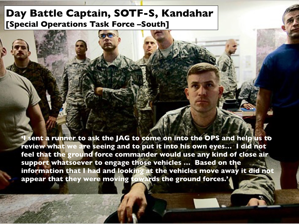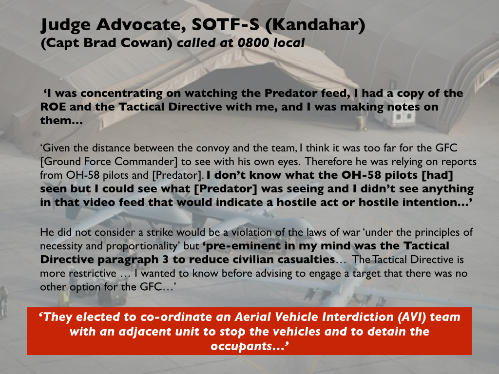 Distance was also a key factor for others in the Operations Center at SOTF-South because – unlike Benton – they realised that the vehicles were now much further from Khod than when they had first been spotted. At the very least – again, in contrast to Benton’s harried urgency – they believed this bought them time. When Petit finished his call with Benton (he had simply listened to his superior and promised to call back after he had been briefed) he admitted he was in a state of ‘near panic’ (p. 1112). But he relaxed when he heard the vehicles were still so far from Khod: he told McHale ‘we felt like we had time’ to decide a course of action (p. 1113). The JAG stepped forward and gave Petit his legal opinion: there were insufficient grounds for an airstrike. Not only were the vehicles increasing their distance from coalition forces – moving away rather than closing – but also, and more importantly, they did not constitute a legitimate military target: ‘I didn’t see anything in that video feed that would indicate a hostile act or hostile intent’ (p. 610). [137] The likely presence of children also gave him pause. The resolution of the Predator feed was ‘fairly poor’, he said, so that ‘if someone was being identified [by the screeners] as a child through that view, then he must be fairly young… It must have been obvious that they weren’t a fighting-age male’ (p. 607). he absence of heavy weapons was another concern. He required evidence of ‘something more than just AK-47s,’ he explained, ‘which are not an indication of hostile intent. Everybody has a weapon in this country. Something bigger, something crew-served, some mortar system, a larger number of weapons, more than just a few ‘ (p. 613). [138] In sum, Cowan believed that in the circumstances ‘some sort of show of force or potential escalation of force’ (p. 604) would achieve the ‘same effect as engaging the target’ (p. 615) and unlike an airstrike would be consistent with the Tactical Directive. [139]