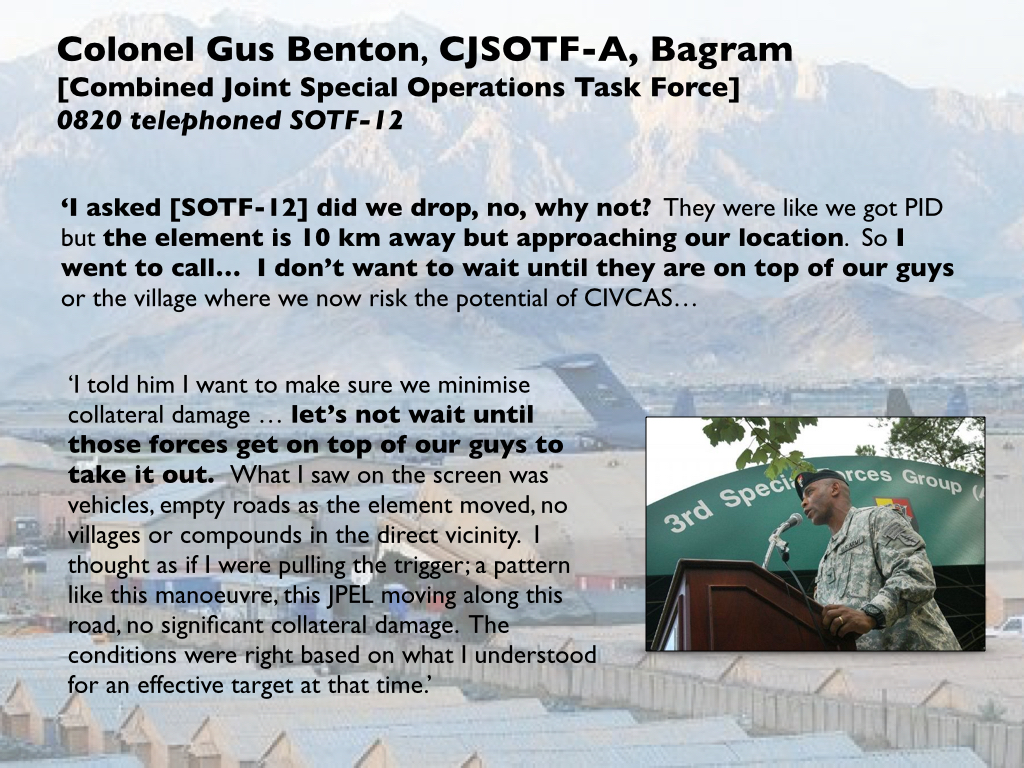 But the second part was more problematic. Benton endorsed the GFC’s early belief that a ‘High Value Individual’ (HVI) on the JPEL target list was among the passengers, though he later admitted he had no direct knowledge of one at all. In any case, he had other, more urgent reasons to want a strike. He was convinced that the vehicles and their occupants displayed a suspicious ‘pattern of life’ (a phrase he repeated several times) – that the vehicles were maneuvering tactically (’that pattern of maneuver’) – and that there was no time to waste.