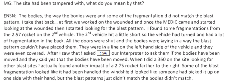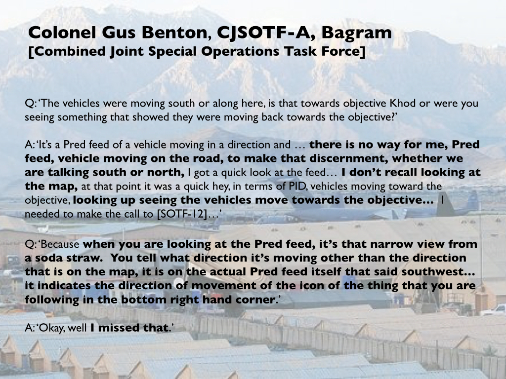 Benton was not alone in his casual attitude towards geo-location. His Night Operations Chief told McHale that from the time they woke Benton until he walked into the Operations Center ‘nothing changed’ and they briefed him accordingly. And he too insisted that when the vehicles were hit they were closer to Khod than when they were first spotted. ‘It’s hard for me to stay in my seat,’ exclaimed one exasperated member of McHale’s team (maybe the same one). ‘It’s about 5½ kilometers when they start in the north and 15 kilometers [nine miles] when they got struck.’ ‘What’, he wanted to know, is ‘the responsibility of the Ops Director with situational awareness and understanding?’ (p. 1472).