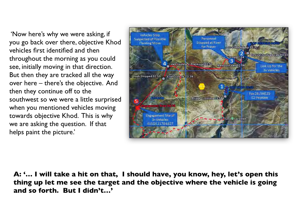 ‘Now here’s why we are asking. If you go back over here [indicating the map], objective Khod, vehicles first identified and then throughout the morning, as you can see, initially moving in that direction. But then they are tracked all the way over here – there’s the objective. And then they continue off to the southwest, so we were a little surprised when you mentioned vehicles moving towards objective Khod… If that helps paint the picture’ (pp. 547-8).