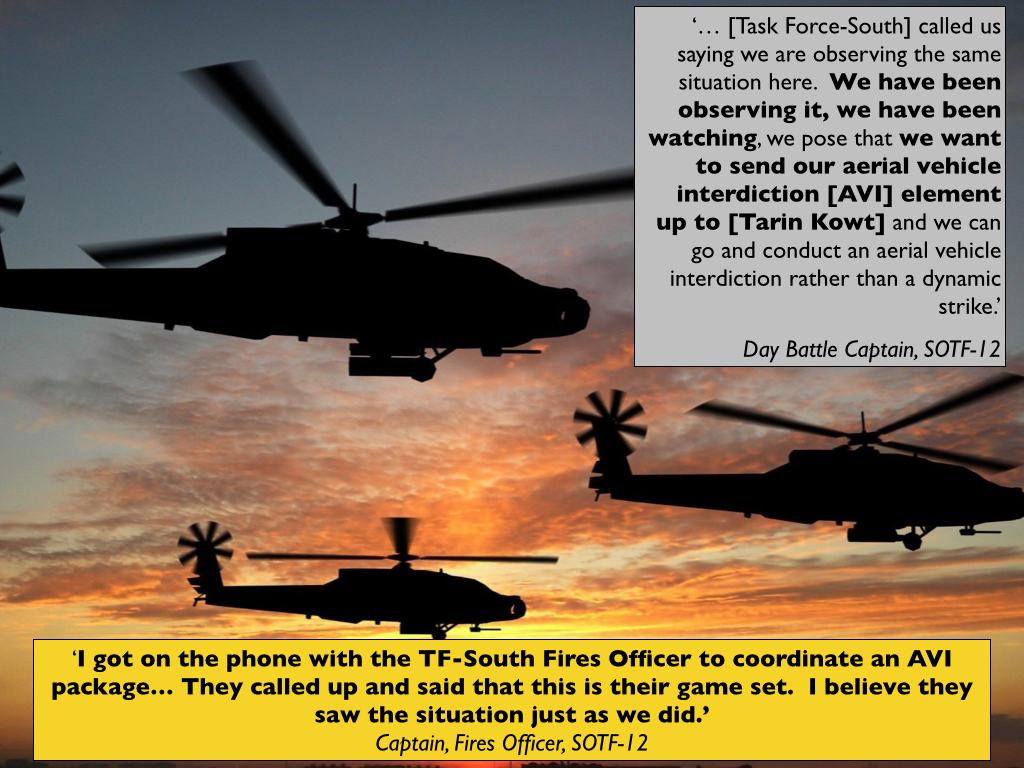 Almost immediately after Petit hung up, another secure phone rang. It was a major that Petit knew from Task Force–South, a Ranger-led Special Operations unit also based at Kandahar Air Field, whose unit carried out HVI targeting and relied heavily on remote platforms for ISR. [140] They had also been watching the Predator feed, and he told Petit this situation was ‘along the lines of their mission set.’ He offered to send an Attack Weapons Team – AH-64 Apache helicopters – to conduct an Aerial Vehicle Interdiction (AVI) in which the vehicles would be forced to halt, ideally without opening fire, so they could be searched and the occupants questioned (p. 725). This was in accordance with standard US military doctrine – which stipulates that ‘missions attacking targets not in close proximity to friendly forces … should be conducted using air interdiction (AI) procedures’(my emphasis) [141] – so that if the occupants proved to be hostile they could be engaged in full knowledge of their intent. This chimed with Cowan’s recommendation, and the Day Battle Captain agreed that an escalation of force was the right response in the circumstances (‘the best bet’: p. 1230). The Fires Officer was also cautious, but preferred a different course of action. In his view, the vehicles had changed ‘from tactical maneuvering to just travelling,’ as one of McHale’s team put it (p. 724), and he suggested that ‘we continue to follow with the Predator and watch to see where they go.’ This had been the GFC’s original intention too. ‘I thought we could get better intelligence by watching to see where they go and who they link up with,’ the Fires Officer told Petit, ‘rather than interdicting them.’ But Petit had evidently absorbed enough of Benton’s argument – and the requirements of the Tactical Directive – to make him reluctant to wait and see what developed. If they failed to act, the vehicles might end up ‘somewhere we couldn’t stop them at that point, like a compound’ (pp. 725-6). And so it was agreed to arrange an AVI.