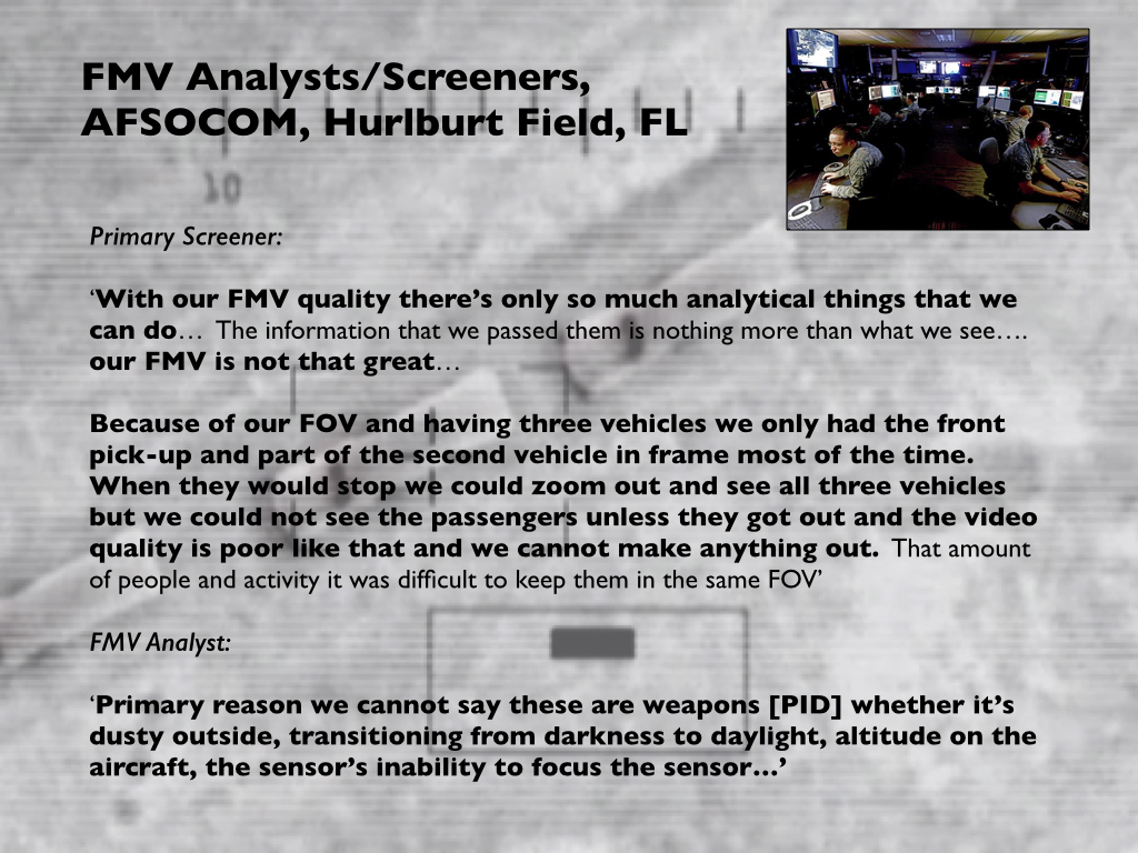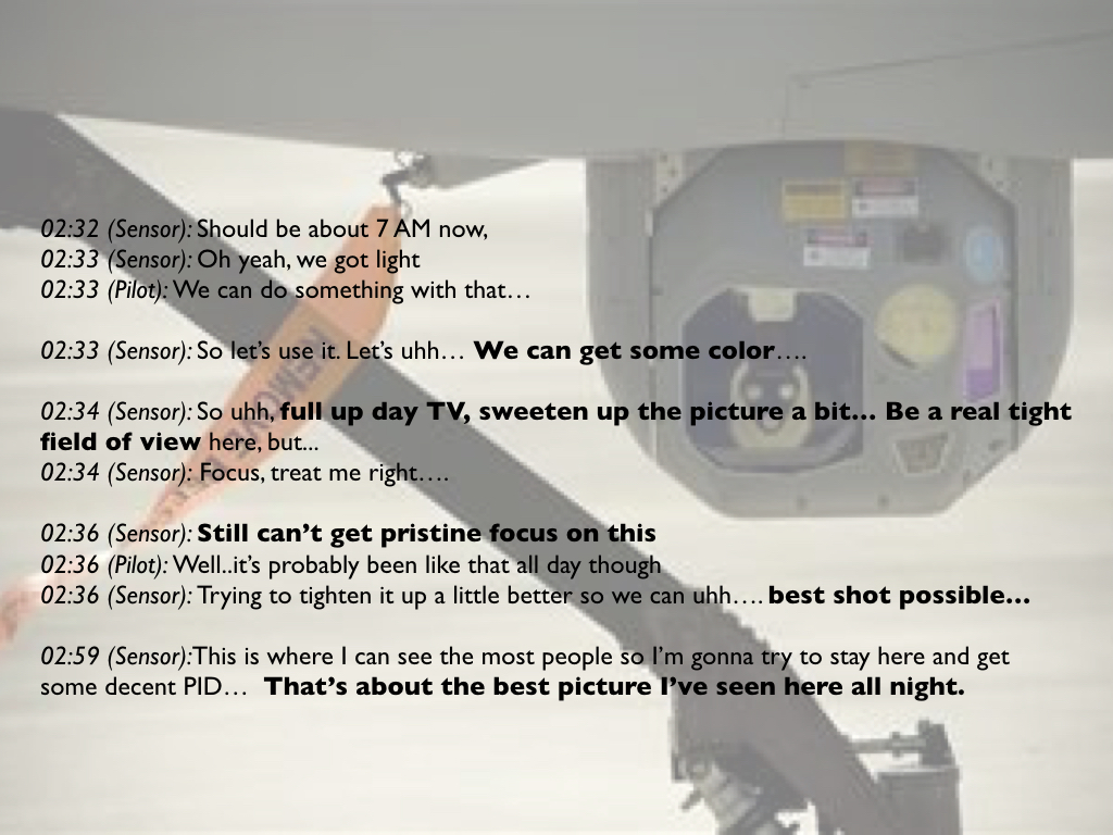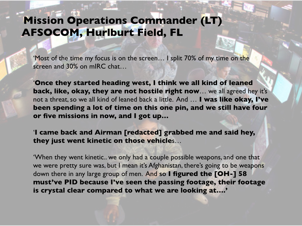 But it could see them, and a couple of minutes later the MC directed the crew’s attention to ‘that [infra-red] spot in the back of that truck.’ ‘It’s all their guns,’ the sensor operator told him. This too was a leap of (bad) faith, followed by yet another. When the MC passed the screeners’ identification of an adolescent near the rear of the SUV, the sensor operator responded with ‘teenagers can fight’, which the MC amplified: ‘Pick up a weapon and you’re a combatant, that’s how it works’ (it isn’t). Once the screeners identified an additional weapon, the pilot was evidently satisfied that they were now on the same page as him and his crew: ‘I’ll make a radio call,’ he said on the intercom, ‘and I’ll look over [at mIRC] and they will have said the same thing…’ This was not the screeners’ view – to the contrary –but it served to enrol them in the crew’s elaboration of their narrative. It also reversed the inferential order, since the role of the screeners was to pass expert calls to the Predator crew for transmission to the GFC rather than act as secondary confirmation.