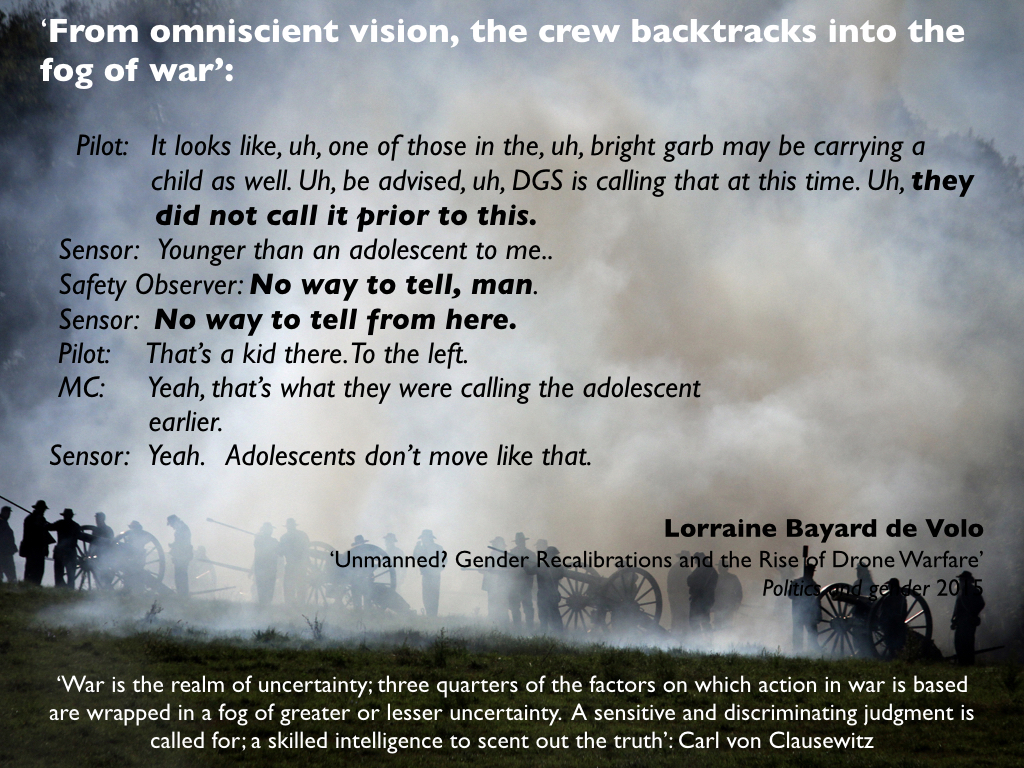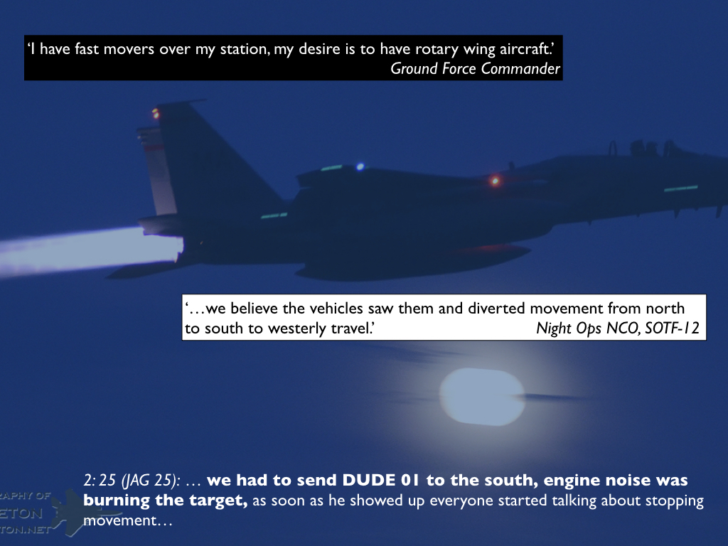 Here is the third installment of my essay on an airstrike on three vehicles in Uruzgan, Afghanistan on 21 February 2010 that has become one of the central examples in critical discussions of remote warfare. The first installment is here and the second is here. The background to the essay is here. And to be clear: many of the images I’ve used in this and the previous posts are taken from my conference presentation; some relate directly to this incident but others (as I hope will be obvious) are intended to be illustrative and do not portray the engagement under analysis.