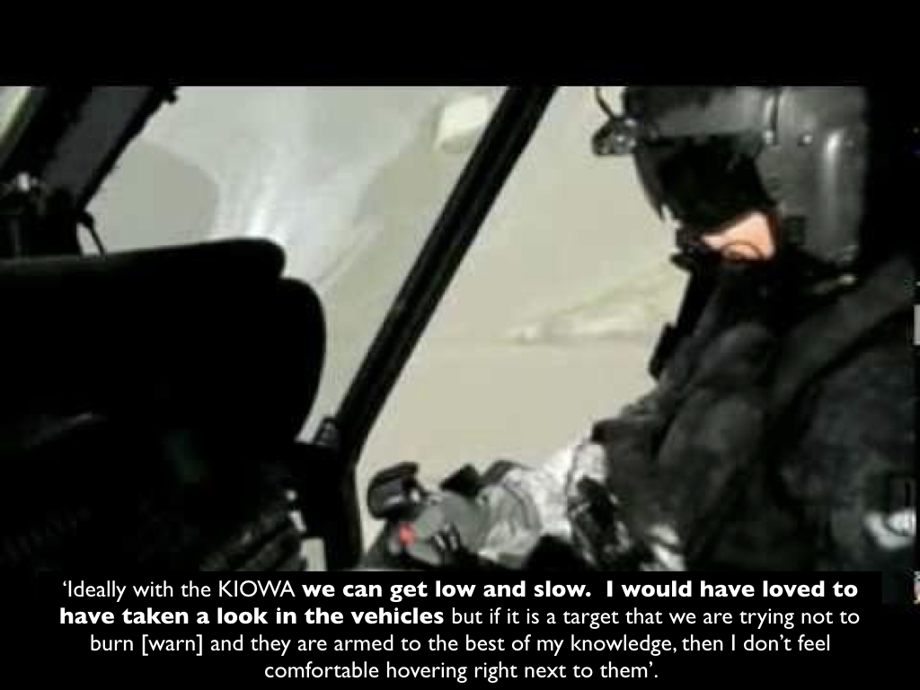 The Predator crew clearly had no pre-strike guidance from a military lawyer from the Judge Advocate-General’s Corps (known as a JAG). By 2005 JAGs were part of the US Air Force’s ‘kill-chain’, stationed on the operations floor of CENTCOM’s Combined Air Operations Centre (CAOC) at Al Udeid Air Base in Qatar to advise on targeting. [116] They were also forward deployed in Afghanistan, but the Safety Observer at Creech Air Force Base, who was called in shortly before the engagement and whose responsibilities included ‘making sure the ROE had been met’, confirmed that there was no JAG ‘on site to consult during these engagements’ (p. 1459). [117] In any case, the leading strike aircraft in this instance would be the OH-58 helicopters. As the Predator crew had realised, the onus was on the GFC, who had to decide whether the vehicles constituted a legitimate military target whose execution fell within the ROE and the Tactical Directive, and then order the JTAC to issue a ‘nine-line’ brief and clear the aircraft to engage. [118]