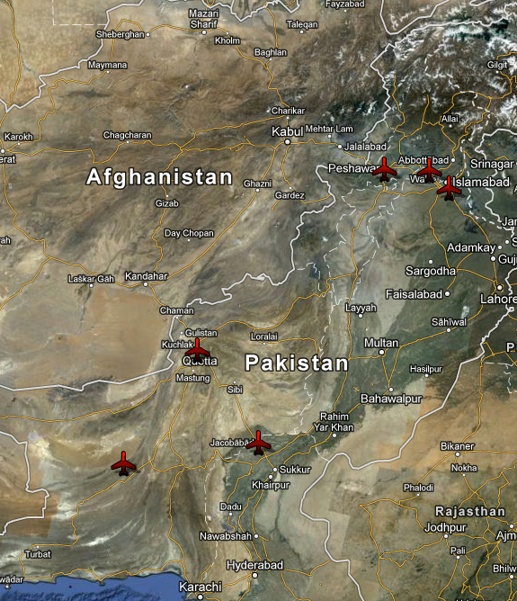 We know, from the Wikileaks cache of diplomatic cables from the US Embassy in Islamabad, that in August 2008 Prime Minister Yousaf Raza Gillani told the Ambassador that he approved of the drone strikes as part of ongoing offensives in the FATA – ‘I don’t care if they do it as long as they get the right people’ – and that ‘We’ll protest it in the National Assembly and then ignore it.’  But this was more than ‘tacit consent’.  Foust reminds us that, until comparatively recently, US drones were being launched or supported from at least six different air bases inside Pakistan, shown below, including Islamabad, Jacobabad, Peshawar, Quetta and Tarbela Ghazi; the US was ordered to leave Shamsi and had its lease terminated in December 2011.